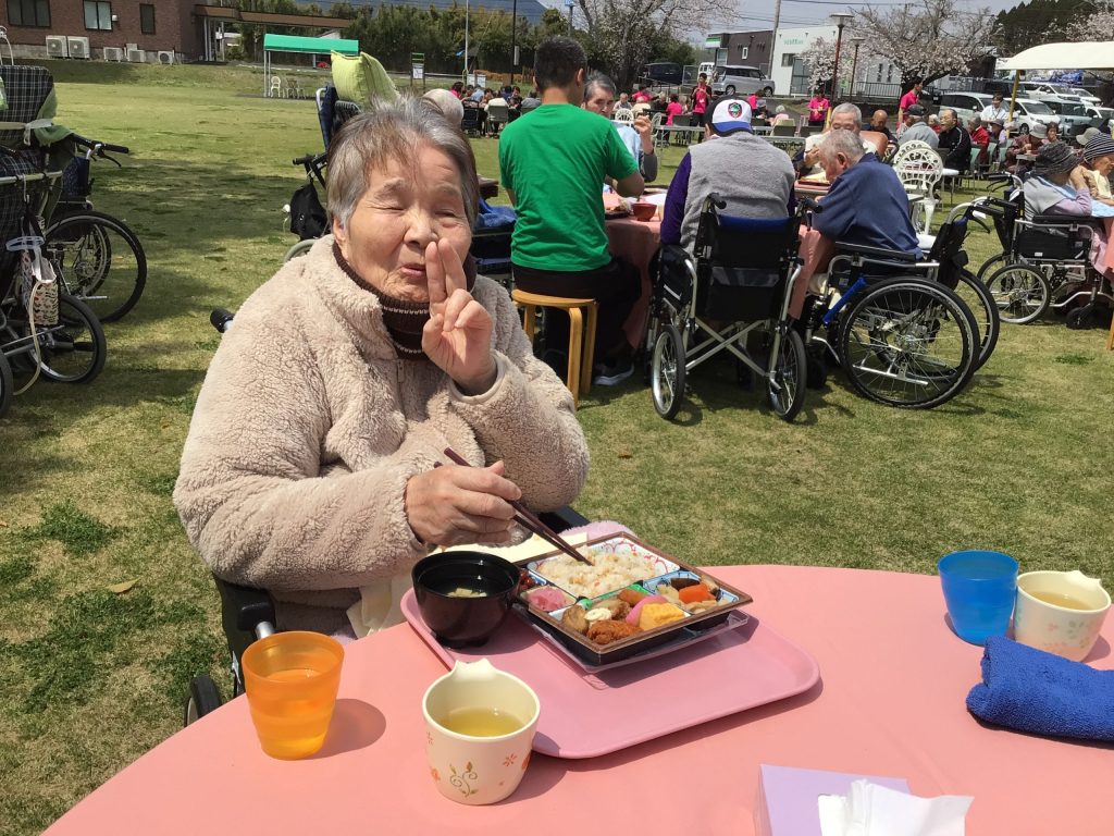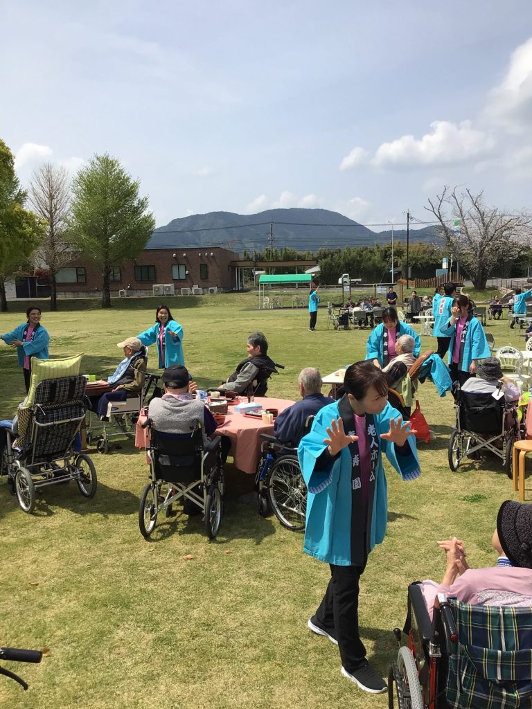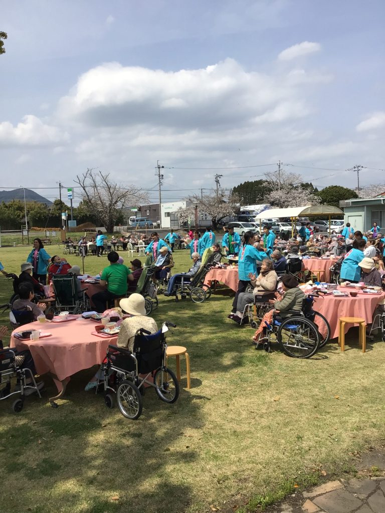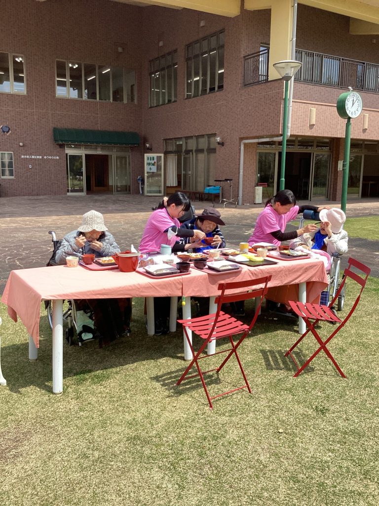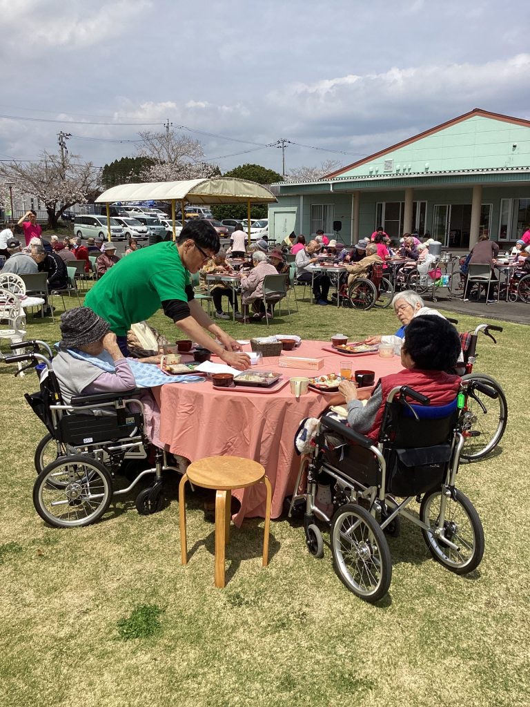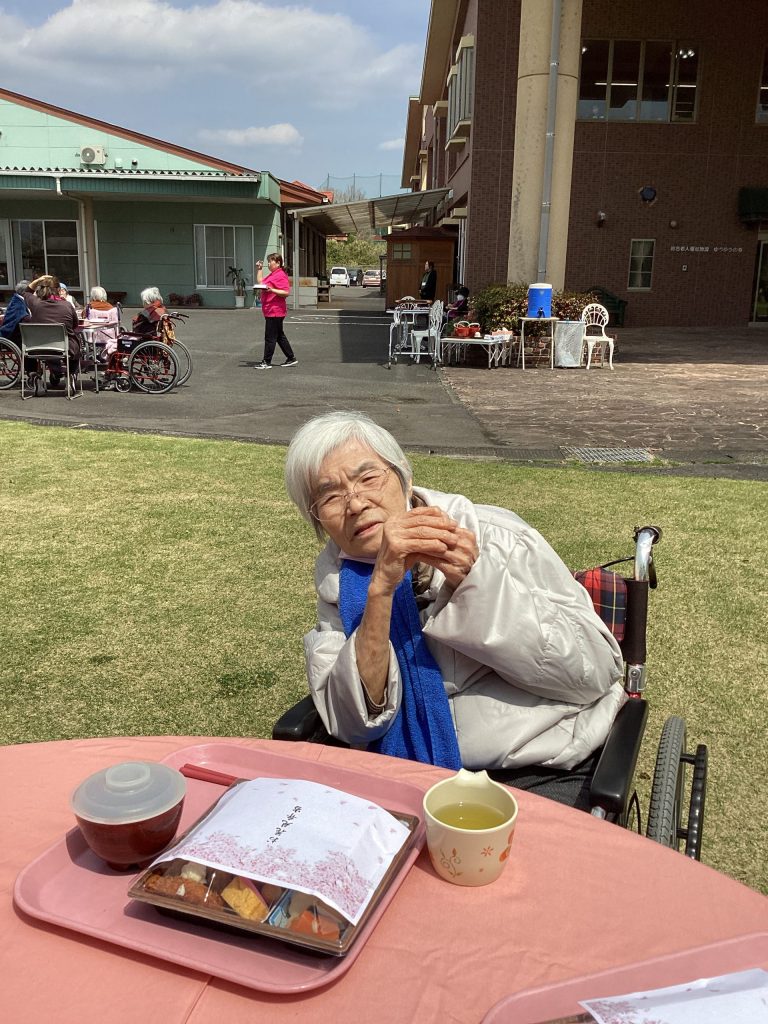 4月3日にゆうゆうの森園庭にて、お花見食事会を開催しました。お弁当を持って満開の桜の下、天気にも恵まれ楽しい時間を過ごせました。普段は中々食事がとりずらい方もバラ寿司などを食べて「ご馳走で美味しい」と普段よりいっぱい食べられる方や、「ご馳走やから今日は箸で食べるわ」など皆さんいつもと違う雰囲気を楽しまれていました。