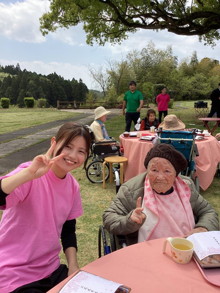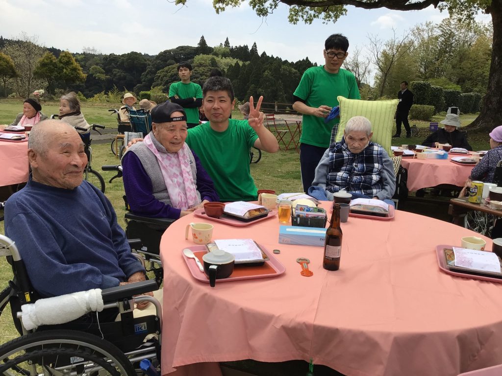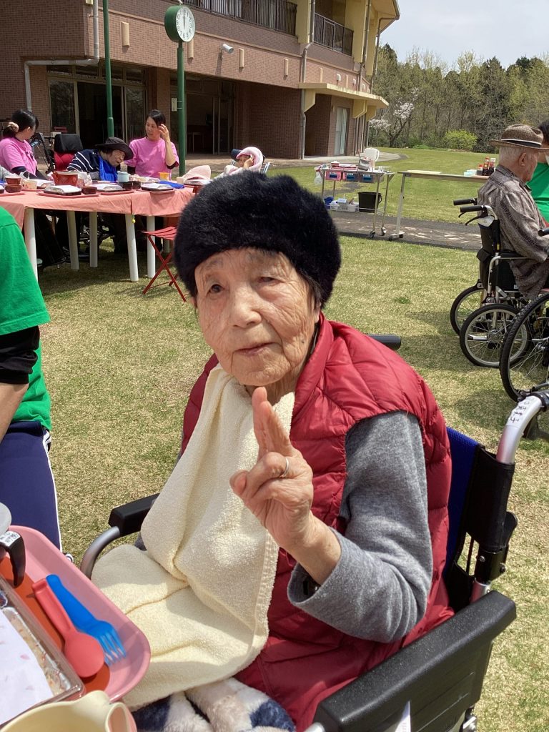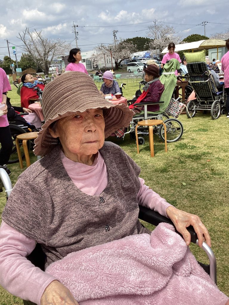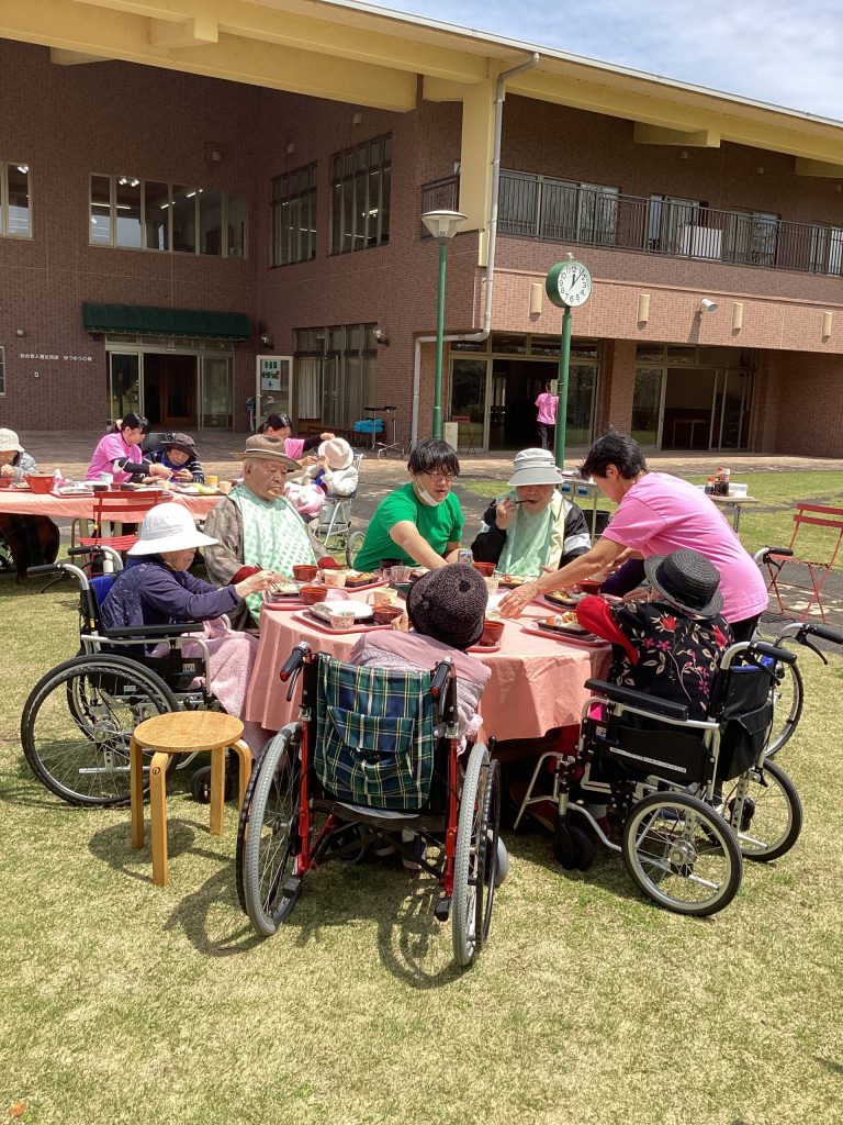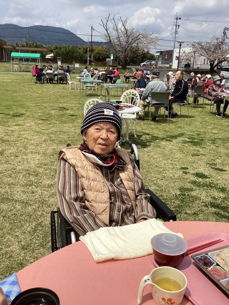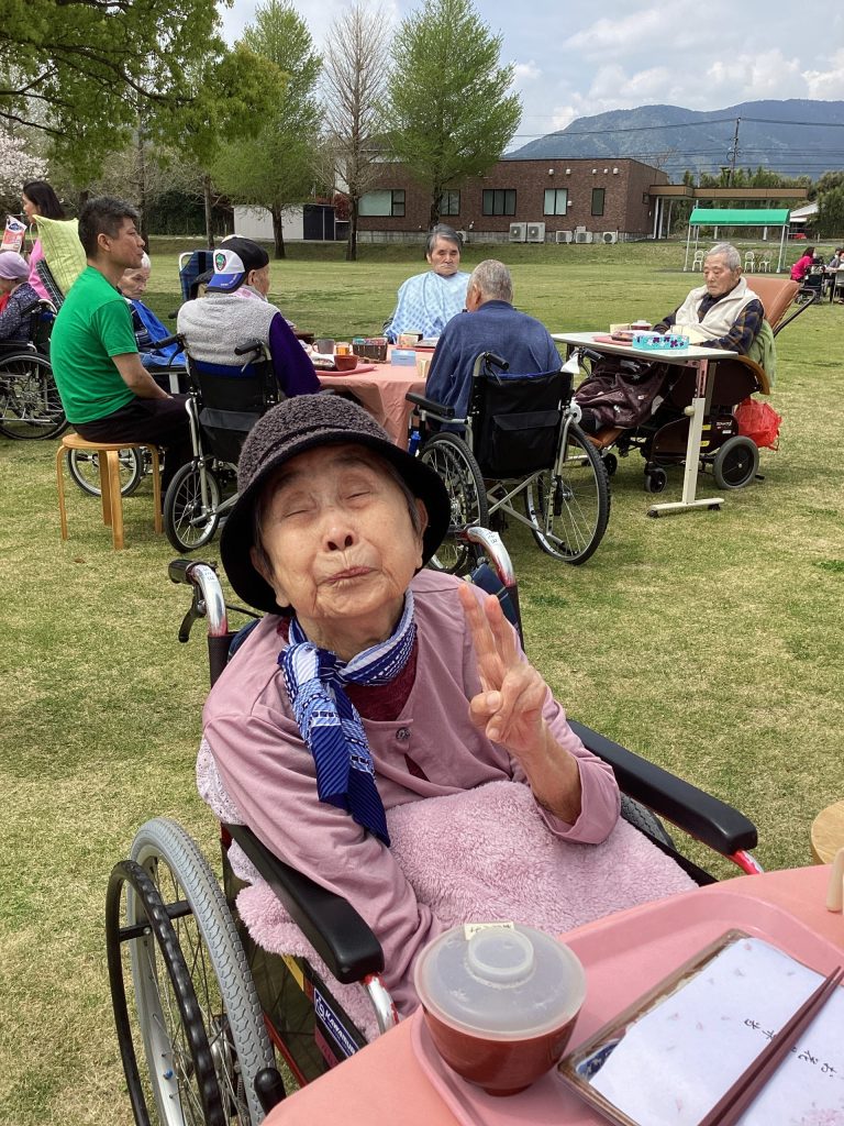 4月3日にゆうゆうの森園庭にて、お花見食事会を開催しました。お弁当を持って満開の桜の下、天気にも恵まれ楽しい時間を過ごせました。普段は中々食事がとりずらい方もバラ寿司などを食べて「ご馳走で美味しい」と普段よりいっぱい食べられる方や、「ご馳走やから今日は箸で食べるわ」など皆さんいつもと違う雰囲気を楽しまれていました。