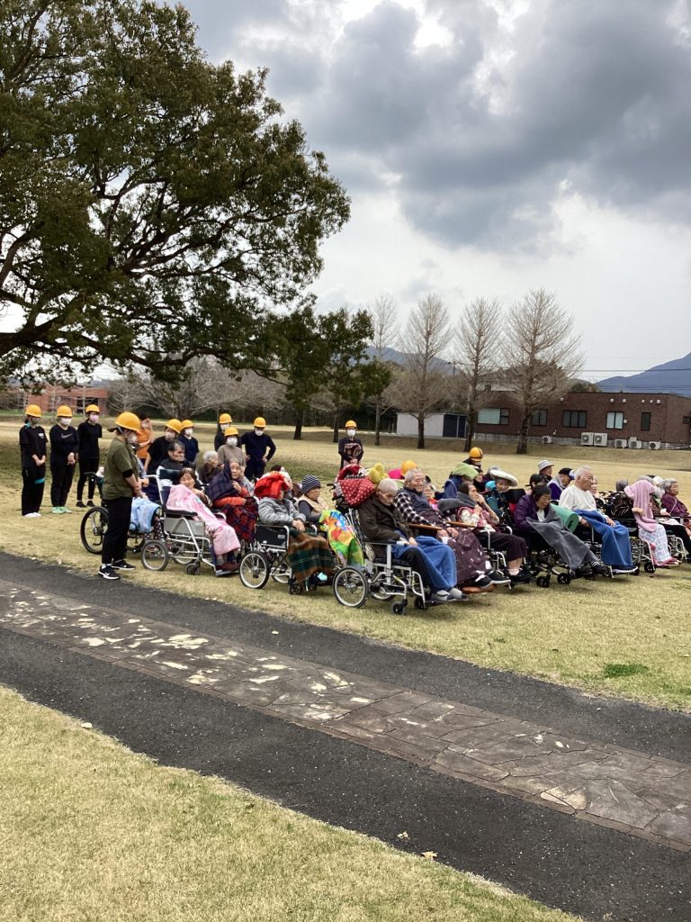 安全確認、避難ルート確保後、利用者様にもゆうゆうの森園庭へ避難して頂きました。避難誘導・安否確認・隊長(施設長)への報告している風景です。災害に備えて備蓄している食料品の運び出しも訓練しました。