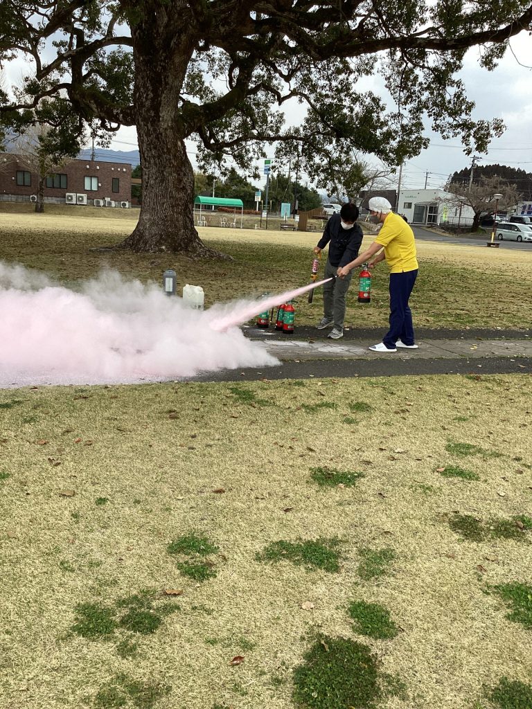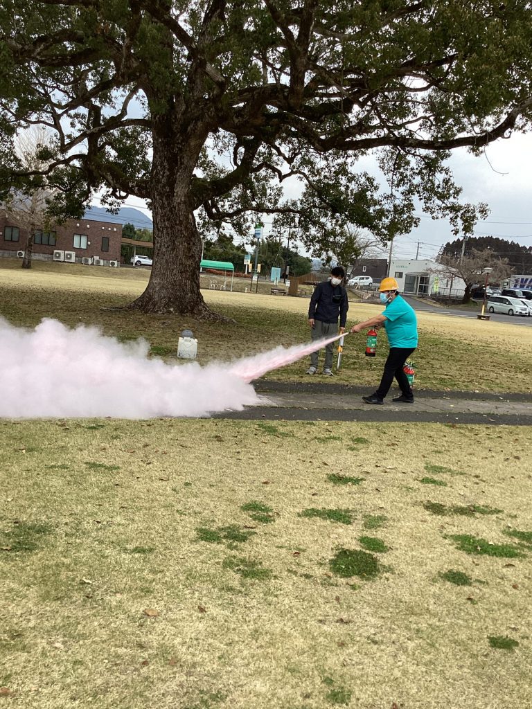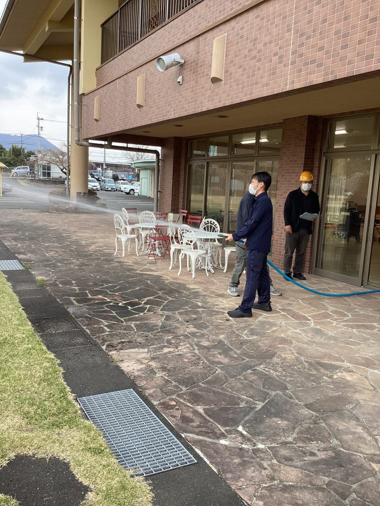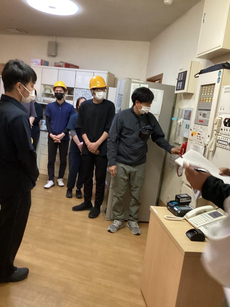 実際に火を使って消火器での消火訓練と散水栓を使っての訓練を行い、防火設備の説明を受けています。